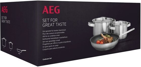 Набор посуды Aeg A3SS состоит из одной сковороды с антипригарным покрытием (24 см) и двух кастрюль (16 см и 20 см). Данный набор совместим с любыми видами варочных поверхностей.