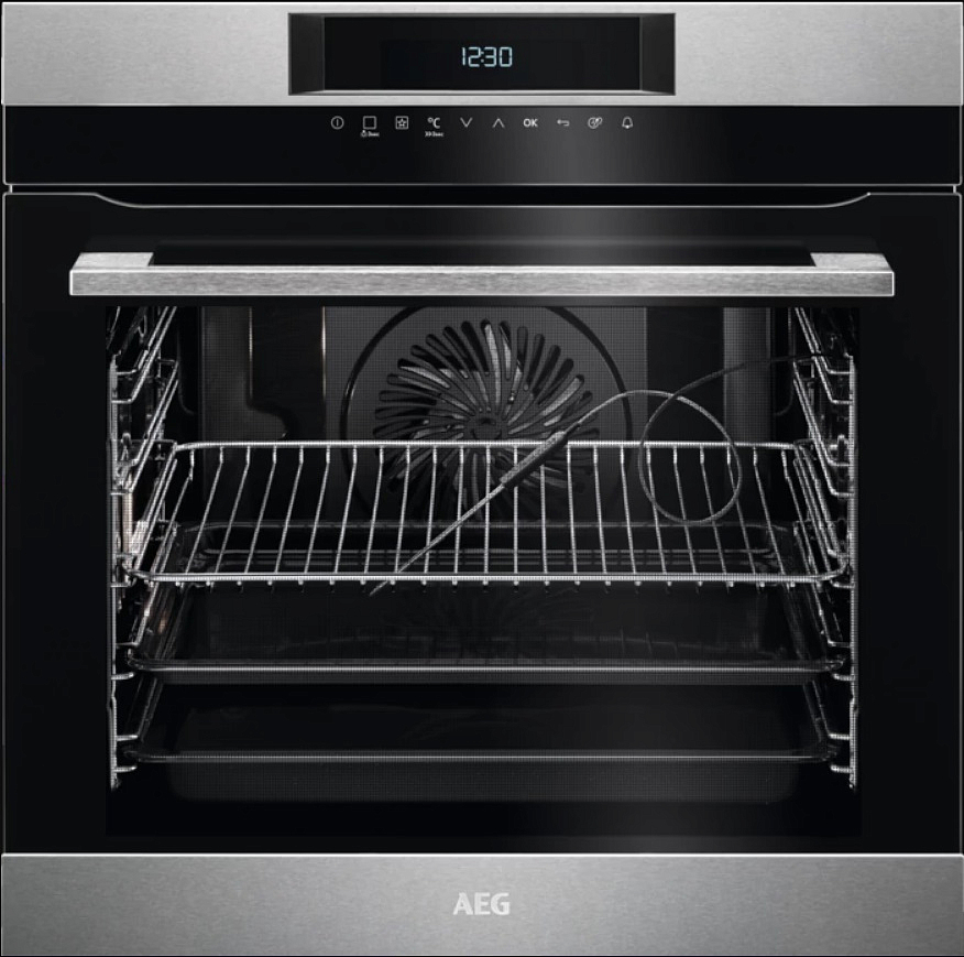 Электрический мультифункциональный духовой шкаф AEG BPR742320M выполнен в цвете «нержавеющая сталь» с покрытием против отпечатков пальцев Antifingerprint. Выбор программ и функций осуществляется при помощи сенсорного дисплея. Термощуп, входящий в комплектацию прибора, точно измеряет температуру внутри продукта и позволяет готовить жаркое нужной степени прожарки. Шарнир Soft Closing обеспечивает мягкое и плавное закрытие дверцы.