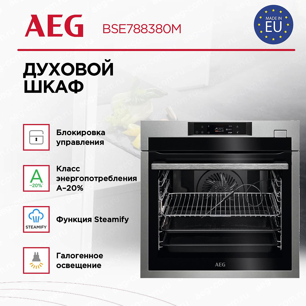 Управление шкафом осуществляется с помощью сенсорных переключателей и электронного дисплея TFT, что делает его использование максимально комфортным и простым. Также присутствует функция Steamify®, которая автоматически настраивает уровень влажности во время приготовления блюд, что позволяет достичь идеального результата. Для удобства использования шкаф оснащен функцией плавного закрытия дверцы и вентилятором охлаждения. Паровая очистка позволяет легко и быстро убрать загрязнения, сохраняя шкаф в идеальной чистоте. Для безопасности пользователей предусмотрена блокировка от детей и функция автоматического отключения духовки. Также в комплекте идут противни и решетка из нержавеющей стали для различных видов приготовления. При всем этом, духовой шкаф AEG BSE788380M отличается высокой энергоэффективностью, что делает его использование экономически выгодным.