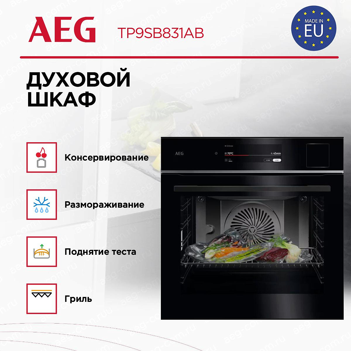 Духовой шкаф AEG TP9SB831AB подчёркивает современную эстетику кухни и вписывается в разные стилистические решения, от минимализма до высокой роскоши. Плоская фронтальная поверхность с эффектной эмалью создаёт аккуратный визуальный акцент, а хромированные направляющие и стальные решётки добавляют блеска и практичности: конструкция выглядит цельной, благородной и легко поддерживаемой.