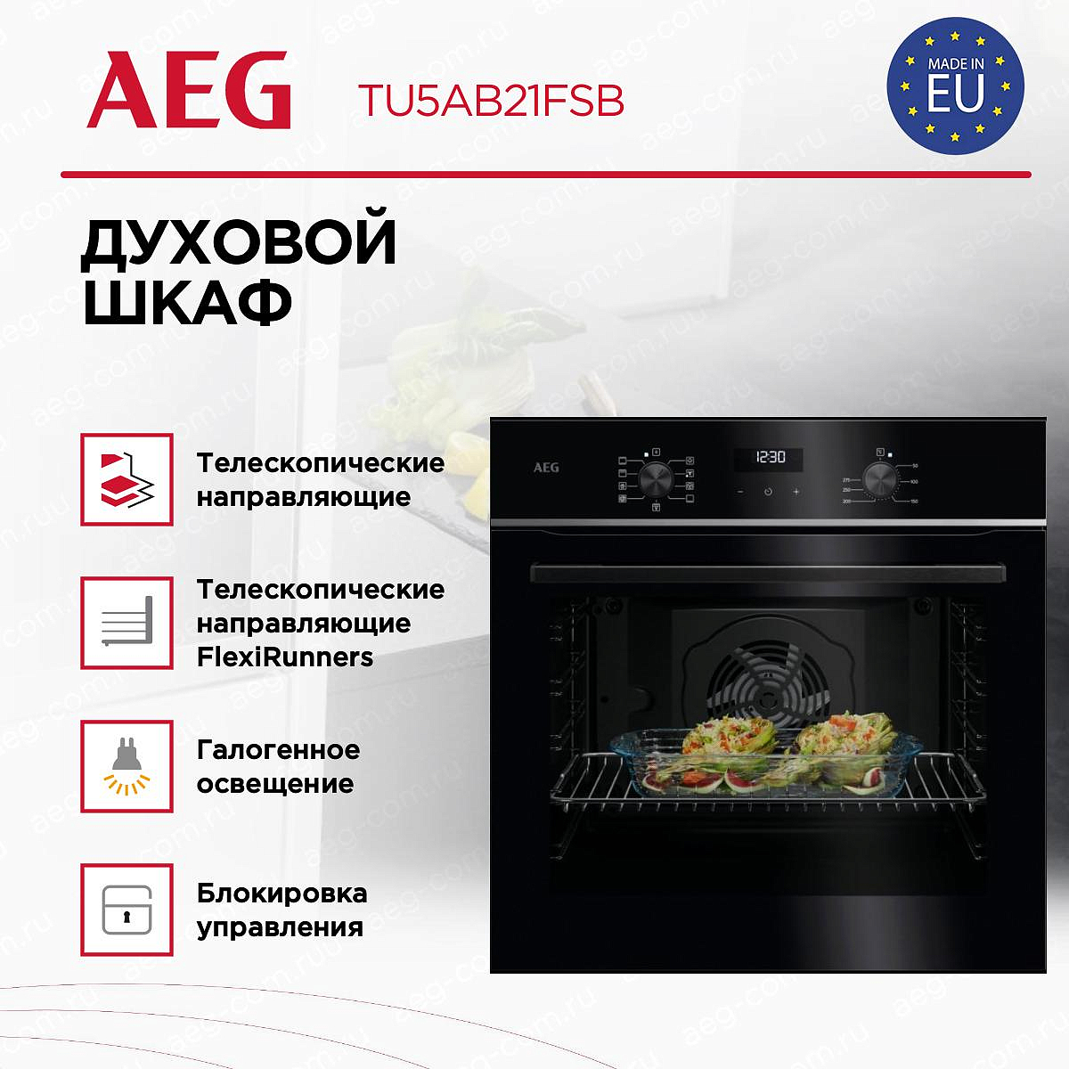 Духовой шкаф AEG TU5AB21FSB — это сочетание изысканного дизайна и передовых технологий. Выполненный в элегантном черном цвете, он станет стильным дополнением любой кухни. Ширина устройства составляет 59.5 см, высота — 58.9 см, а глубина — 56.9 см, что делает его идеальным для встраивания в стандартные ниши размером 58×56×55 см. Этот полноразмерный прибор произведен в Италии, что гарантирует высокое качество и надежность.
