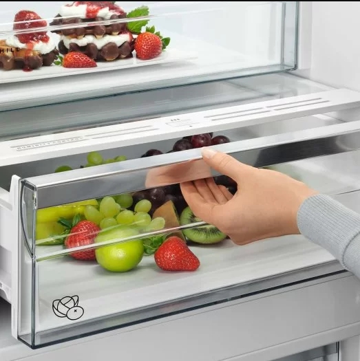 Технология NoFrost в морозильных отсеках холодильников AEG использует динамическую циркуляцию воздуха через встроенные вентиляторы для обеспечения стабильного распределения температуры, предотвращая формирование инея и ледяных наростов. Помимо этого, система активно отводит излишки влажности, исключая возможность конденсации и последующего порчи продуктов, тем самым продлевая срок их годности.