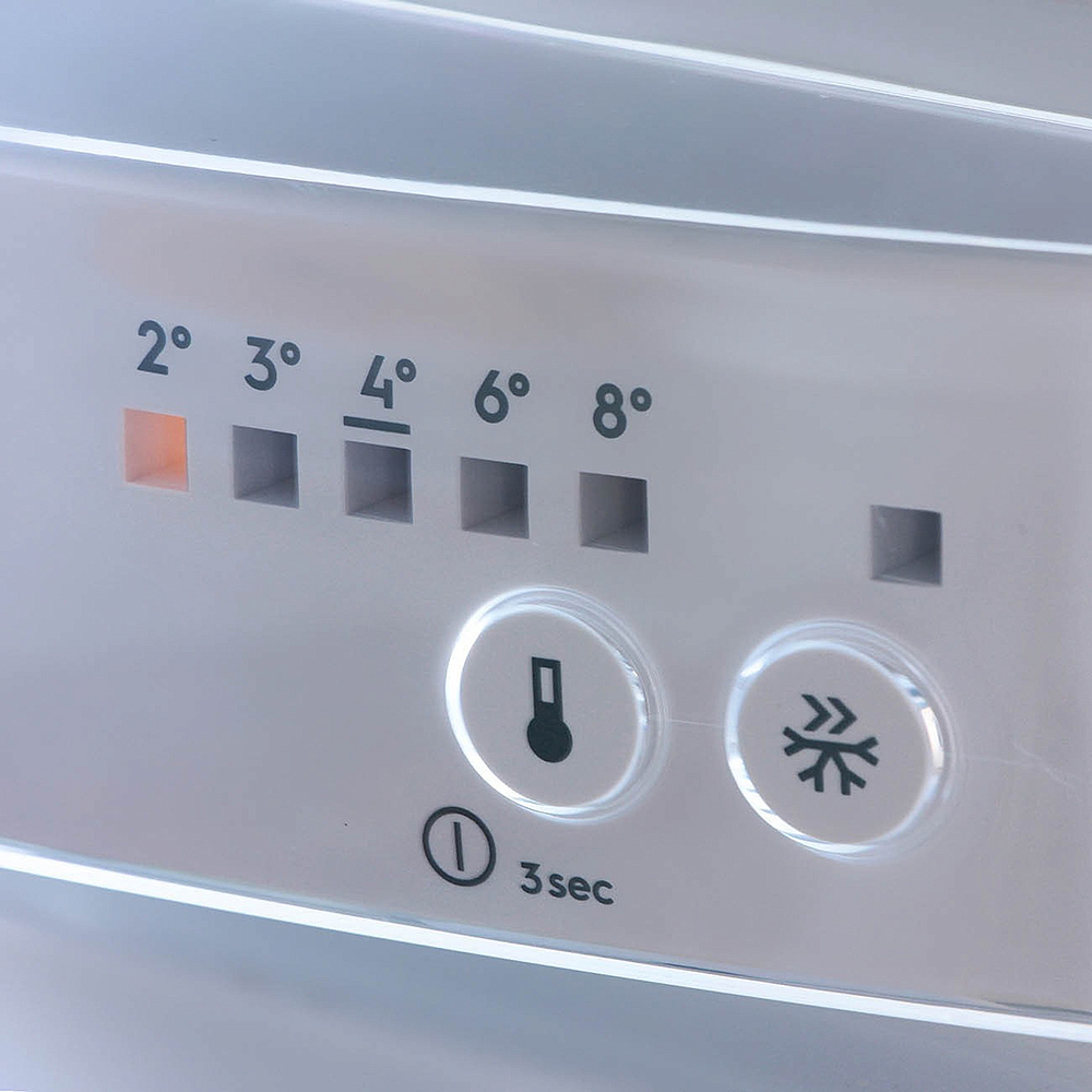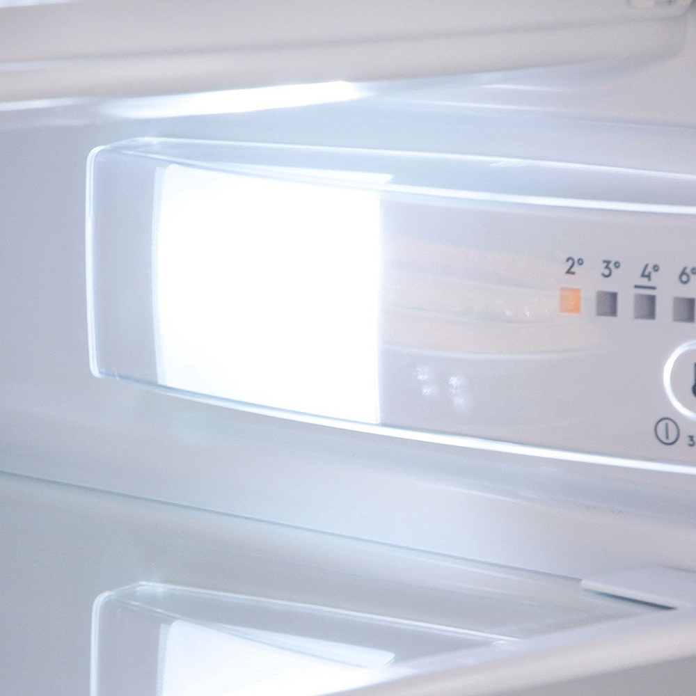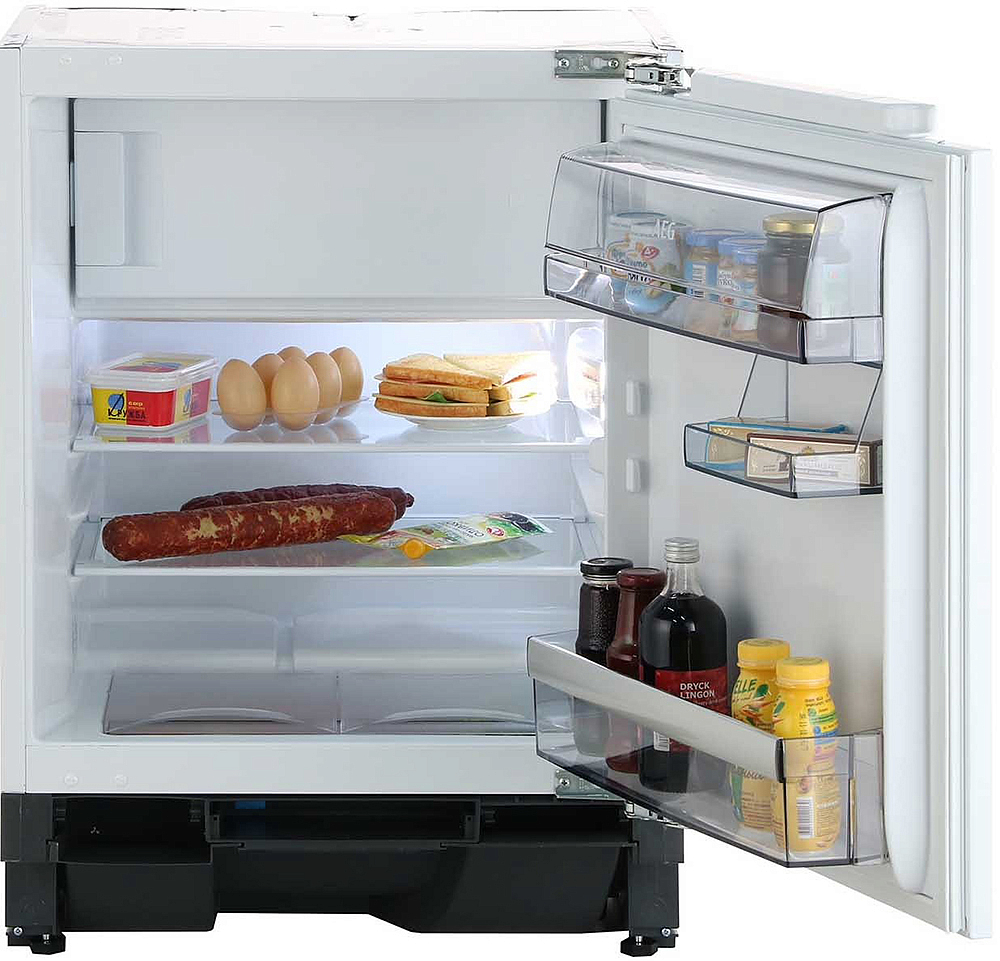 Встраиваемая под столешницу кухонная техника способна хранить большой объем продуктов. Вам не придется переживать о том, что не хватит места. Для лучшей сохранности продуктов в этом приборе предусмотрена сигнализация, которая срабатывает при долгом нахождении двери в открытом положении. Общий полезный объем составляет 109 л, при этом на холодильное отделение приходится 93 л, а на морозильное — 16 л. В первой камере для вашего удобства имеются 3 стеклянные полки, из которых 2 вы можете регулировать по высоте. Это повышает степень удобства при эксплуатации холодильника. В морозилке представлен 1 ящик, но важно отметить, что в течении суток вы можете замораживать до 3,5 кг, что является достаточным в своем объеме.