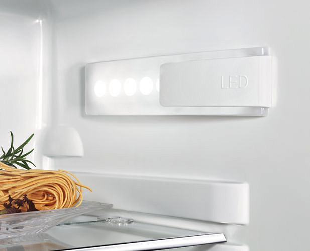 Функция Coolmatic исключает вероятность повышения температуры при большой загрузке, что увеличивает срок хранения продуктов. Светодиодная лампа ярко освещает внутреннее пространство при минимальном потреблении электроэнергии. Удобная и функциональная модель имеет пониженный уровень шума (35 дБ) и соответствует классу энергопотребления A+.