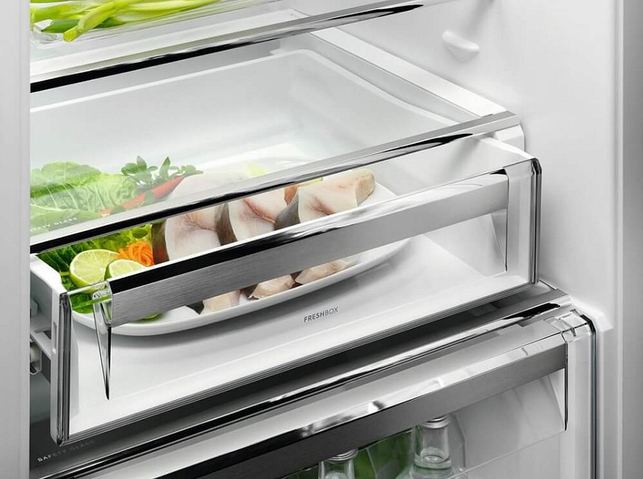 Морозильное отделение оснащено тремя ящиками, выполненными из того же материала. Производительность замораживания составляет 5 кг в сутки, что позволяет быстро заморозить большое количество продуктов. Индикация открытой двери предупреждает о возможной потере холода, а дверной упор справа обеспечивает удобство использования холодильника.