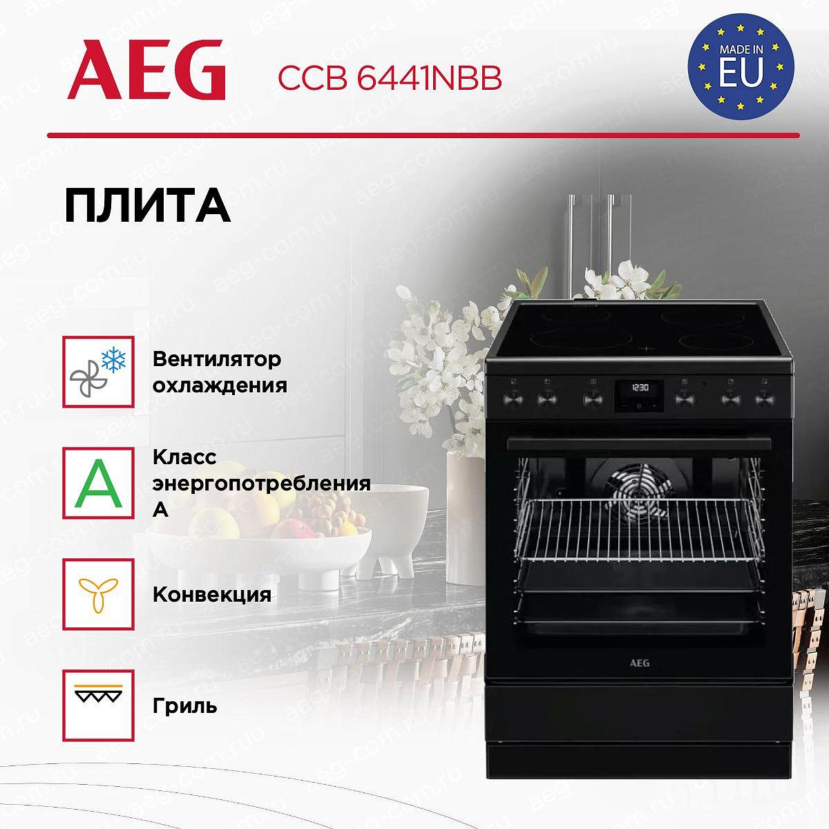 Электрическая плита AEG CCB 6441NBB — стильный прибор в глубоком чёрном цвете, который добавит современную ноту в интерьер кухни и предложит продуманный набор опций для комфортного приготовления. Гладкая стеклокерамическая поверхность тёмного оттенка создаёт эффект монолитности, легко интегрируется в мебельный ряд и визуально увеличивает пространство. Утапливаемые поворотные переключатели и сенсорный программатор дают возможность быстро настроить нужные параметры.