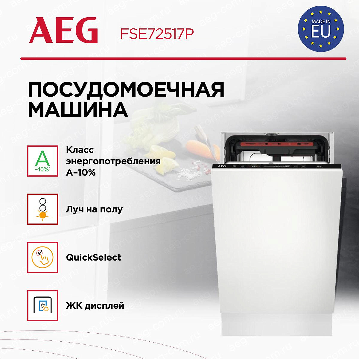 Встраиваемая посудомоечная машина Аег FSE72517P оснащена сенсором чистоты, он определяет качество воды, можно ли ее использовать повторно. Система Pro Clean Satellite обеспечит тщательное мытье, благодаря разбрызгивателю с двойным вращением и пятью уровневой струей. Индикаторы наличия соли и ополаскивателя предупредят, когда средства закончатся, и потребуется добавить еще. Главная особенность — система «Луч на полу». С ней больше нет необходимости периодически открывать дверцу девайса, чтобы посмотреть, закончено ли мытьё посуды. Данная опция сразу оповещает, что работа завершена, это удобно.