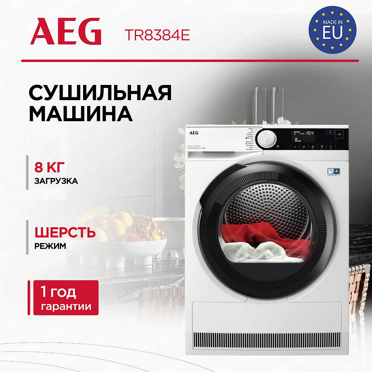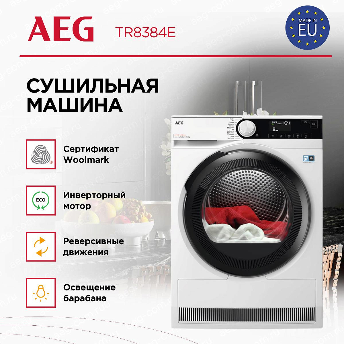 Сушильная машина AEG TR8384E - элегантный и продуманный образ домашней техники превращает элемент быта в украшение интерьера: лаконичный белый корпус сочетается с чёрной панелью управления и загрузочным люком, благодаря чему прибор выглядит современно и сдержанно, вписывается в любую кухню или прачечную. Тонкие линии, аккуратные пропорции и матовая поверхность создают ощущение премиальности, а чёрные акценты подчёркивают технологичность.