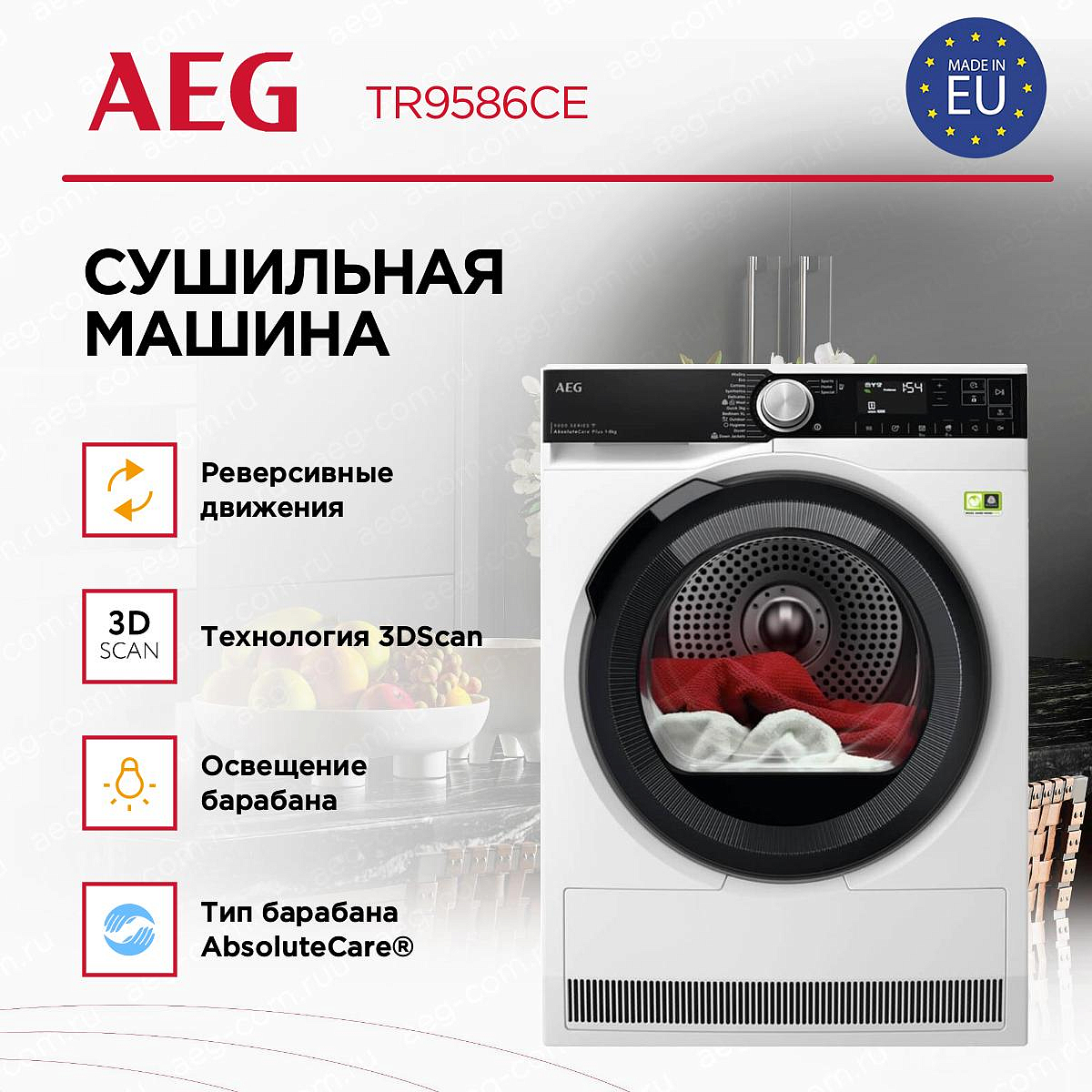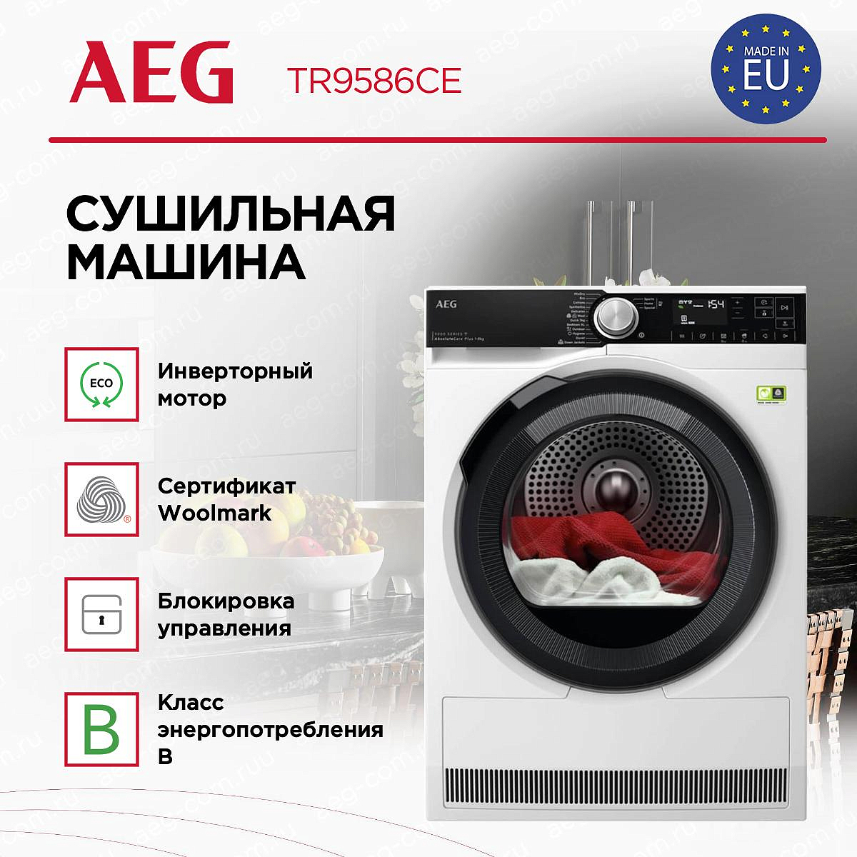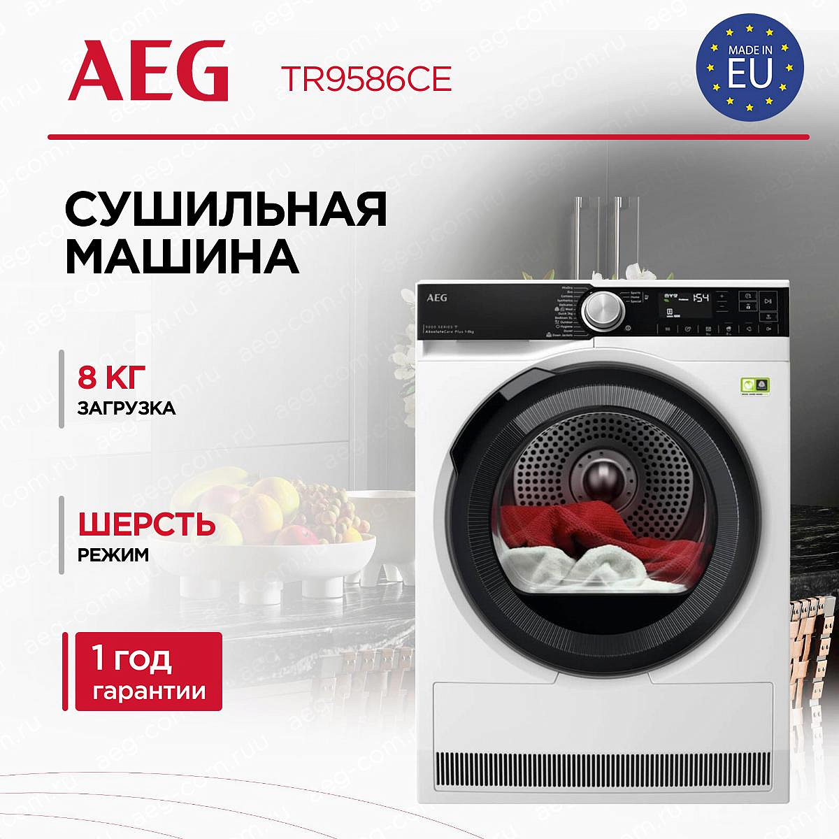 Сушильная машина AEG TR9586CE создаёт современный и сдержанный образ, который легко впишется в интерьер любой прачечной или бытового помещения. Высота 85 см, ширина 59,6 см и глубина 63,6 см обеспечивают привычную стандартную посадку отдельно стоящего прибора, а регулируемые ножки позволяют выровнять его даже на неровном полу. Большой LCD-дисплей выгодно подчёркивает строгую фронтальную компоновку, а сенсорные поворотные переключатели придают операции выбора программ ощущение продуманного контроля: управление остаётся интуитивно понятным, несмотря на богатый набор опций.