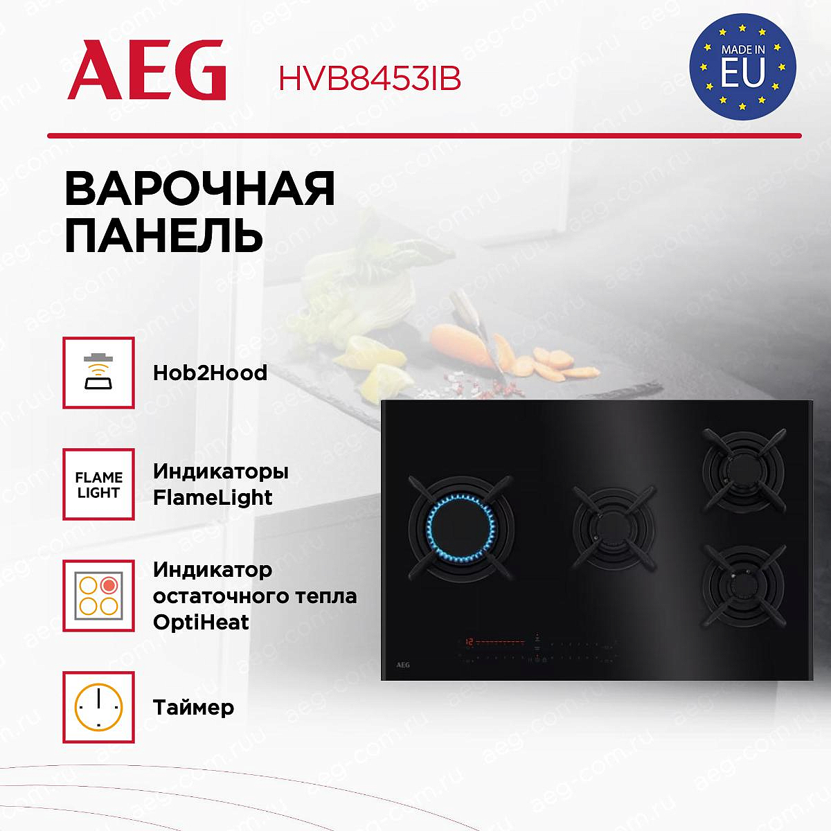 Газовая варочная панель AEG HVB8453IB представляет собой образец современного итальянского дизайна и передовых технологий. Ее поверхность выполнена из закаленного стекла черного цвета с прямым краем и рамкой из матовой стали по бокам, что придает изделию элегантный и стильный вид, идеально вписывающийся в интерьер любой кухни. Размеры устройства позволяют удобно встроить его в нишу шириной 75.5 см и глубиной 49 см, что делает установку максимально простой и аккуратной.