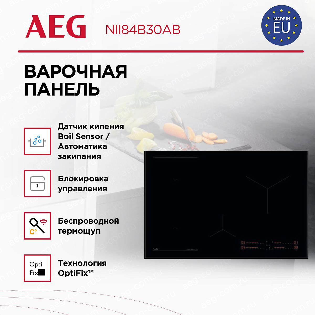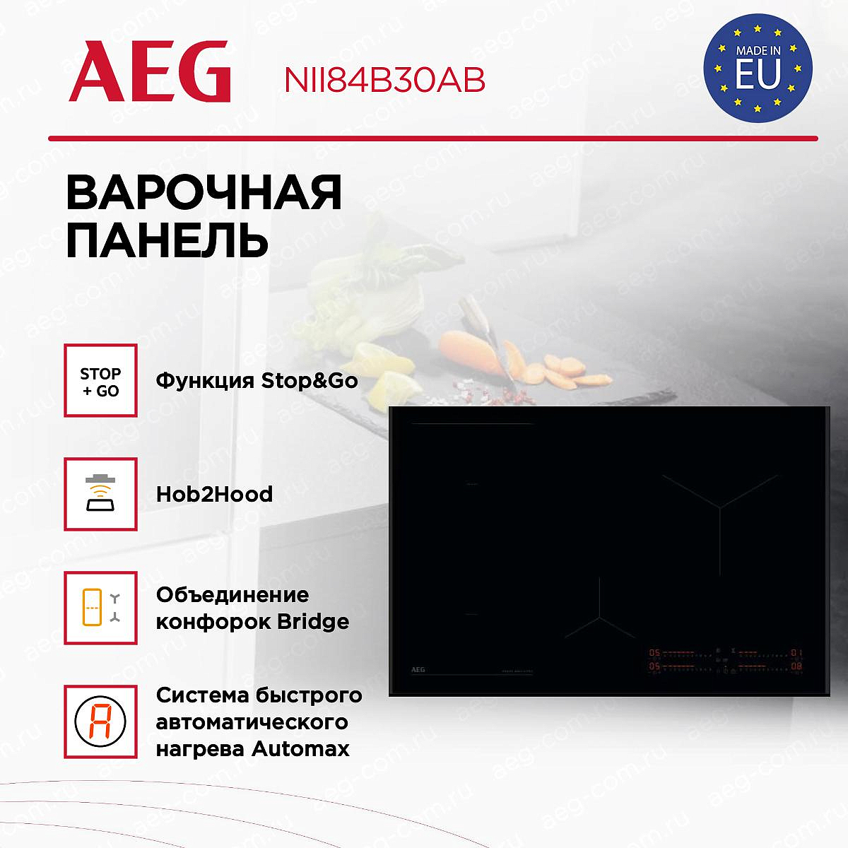 Варочная панель AEG NII84B30AB выполнена в стильном дизайне, в котором стильный корпус чёрного цвета и стеклокерамическая поверхность объединены в утончённом решении для современной кухни, где каждая деталь продумана до мелочей. Технологическая начинка ориентирована на скорость и точность: индукционный принцип нагрева концентрирует энергию прямо в посуде, минимизируя потери тепла, а линейка SenseBoil® добавляет умные функции заготовки и предотвращения выкипания. Сенсорные SliderTouch элементы управления создают интуитивный интерфейс: плавное скольжение по шкале мощности позволяет быстро выбирать нужный режим, цифровой дисплей отображает текущие параметры, а таймер с режимом Eco и звуковым сигналом совместно с отключением упрощают контроль времени приготовления. Функция Stop&Go моментально переводит всю плиту в режим паузы, возвращая прежние установки при необходимости, что удобно при внезапных отвлечениях. Практические опции расширяют возможности: PowerBoost активирует интенсивный нагрев для стремительного разогрева, Automax обеспечивает автоматический быстрый старт, а объединение конфорок Bridge превращает соседние зоны в единую широкую поверхность для больших сковород и грилей.