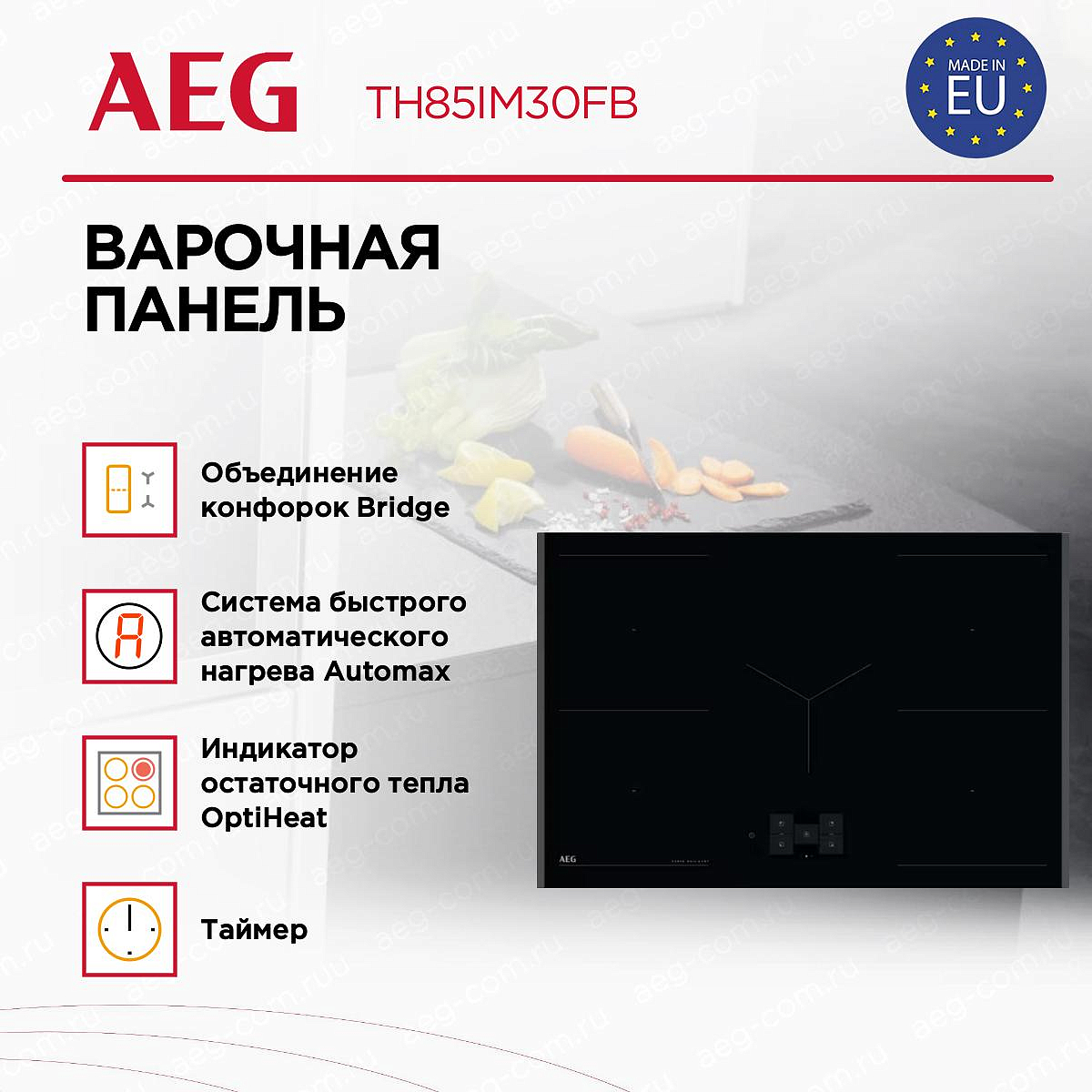 Варочная панель AEG TH85IM30FB — это элегантный и продуманный индукционный прибор. Поверхность из черной стеклокерамики имеет скошенный край, глянцевая фактура облегчает уход и подчёркивает современную эстетику. Электронный тип управления реализован через чувствительные сенсорные элементы и цифровой дисплей для оперативной настройки режимов; встроенный таймер поддерживает варианты Eco, со звуковым сигналом и функцию отключения, повышая удобство повседневного использования. Интеллектуальные технологии обеспечивают ускоренный разогрев Automax и режим PowerBoost, позволяют объединять зоны Bridge для крупных ёмкостей. Hob2Hood автоматически синхронизирует работу вытяжного оборудования, а беспроводной термощуп SenseFry в паре с датчиком кипения Boil Sensor поддерживают точный контроль процесса готовки и отвечают за корректировку параметров без постоянного надзора.